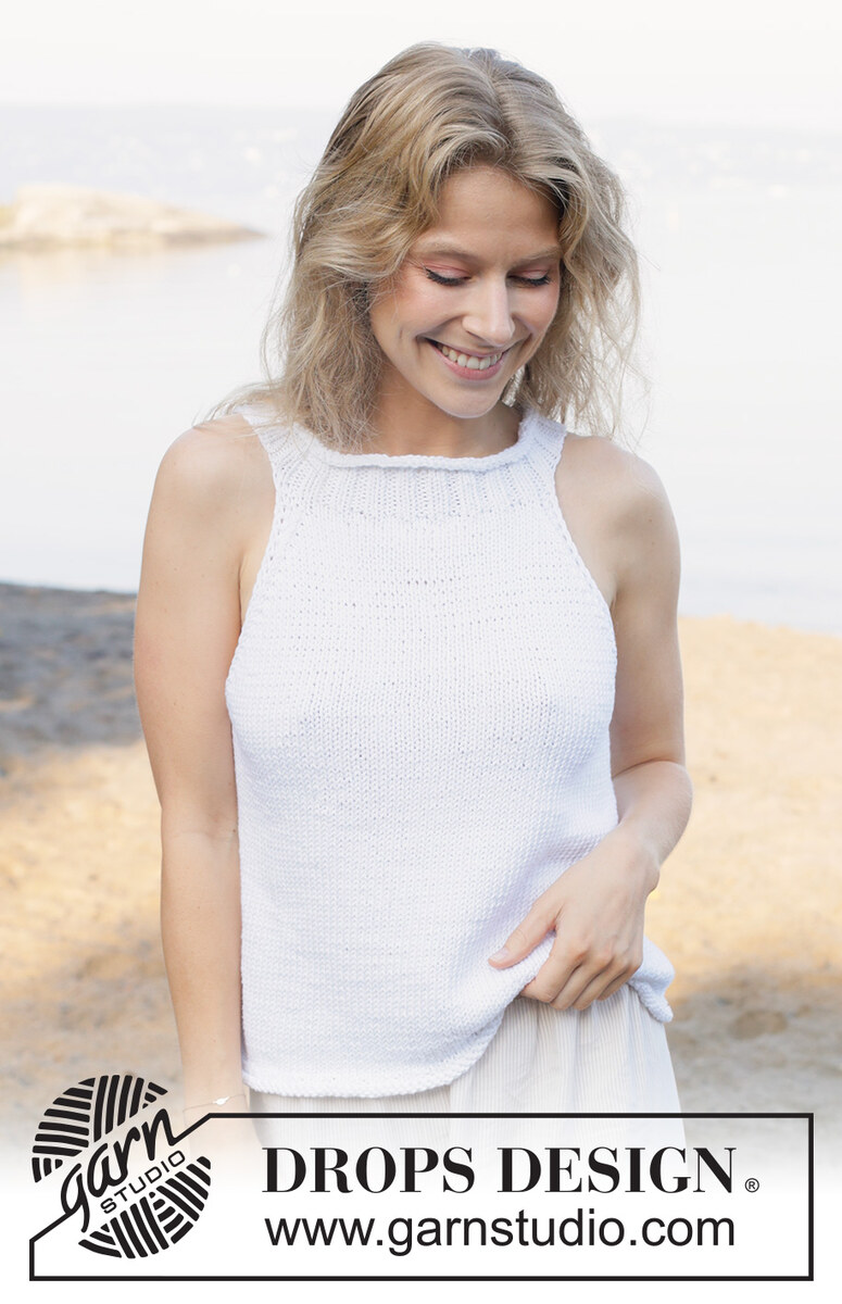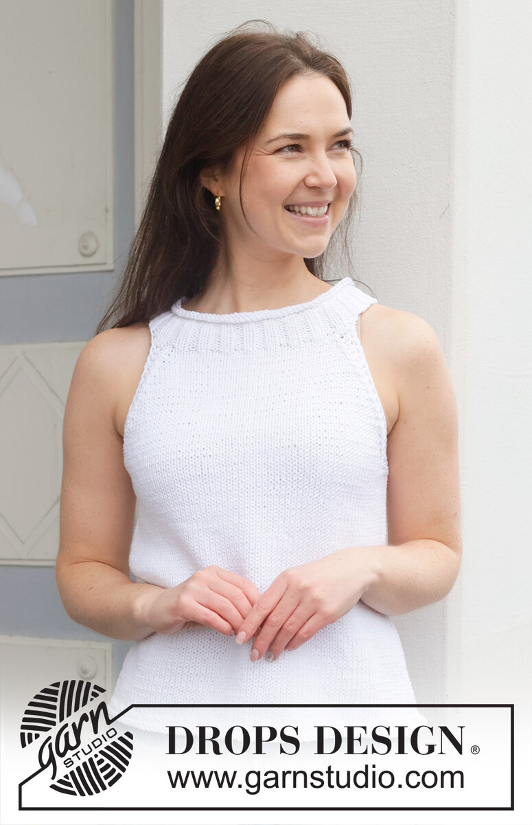 Gestricktes Top in DROPS Paris. Die Arbeit wird von unten nach oben glatt rechts mit Rollrand gestrickt. Größe XS - XXL.
