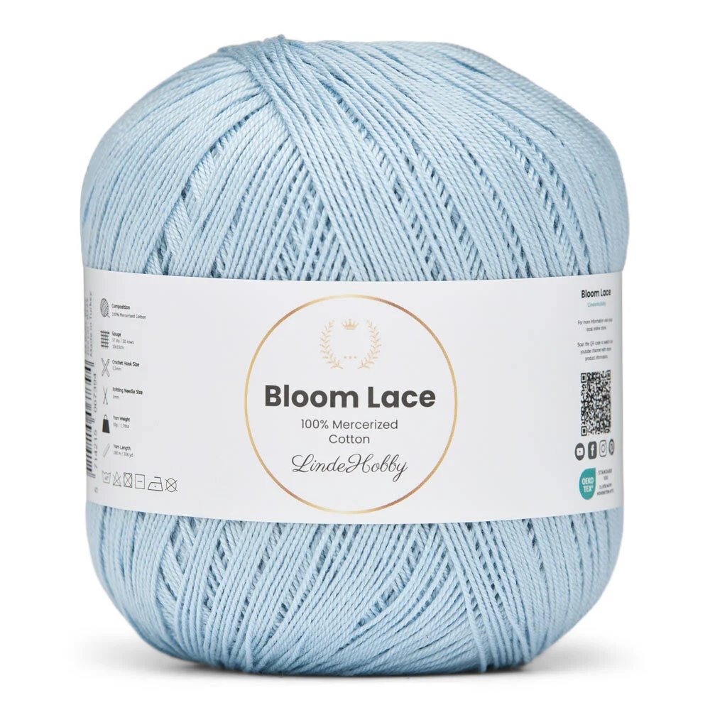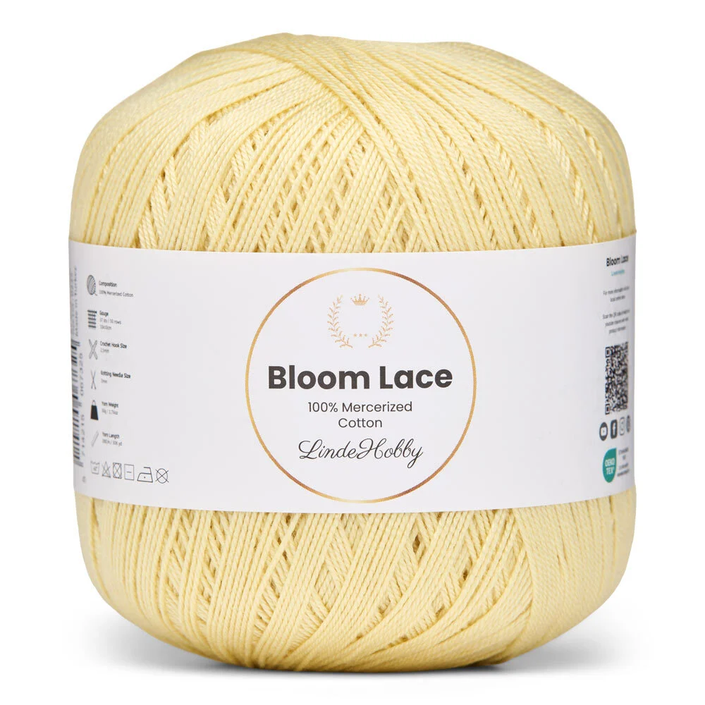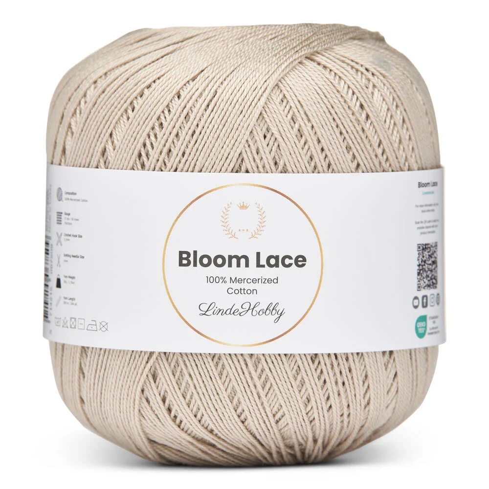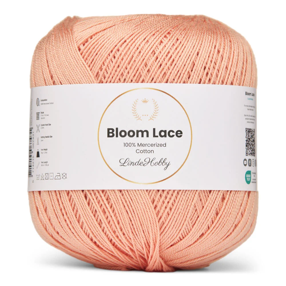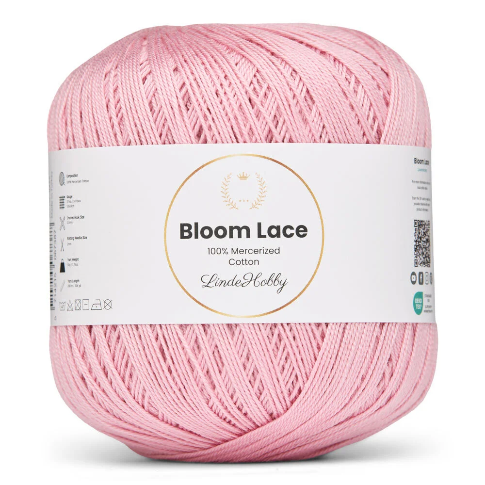 LindeHobby Bloom Lace ist ein luxuriöses Lace-Garn aus 100% mercerisierter Baumwolle. Das Garn hat eine schöne, glänzende Oberfläche und eine dichte, glatte Struktur, die dem fertigen Werk ein exklusives Aussehen verleiht. Das feine und zarte Garn eignet sich perfekt für Projekte, bei denen Präzision und ein elegantes Finish im Mittelpunkt stehen.