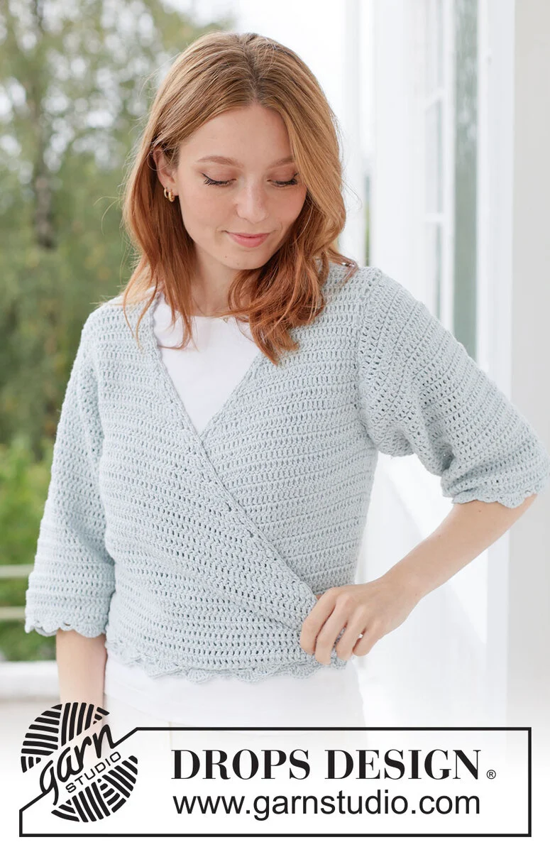 Gehäkelte Wickeljacke / Jacke zum Wickeln mit ¾ langen Ärmeln in DROPS Belle. Die Arbeit wird von oben nach unten mit Stäbchen, Rüschenrand und Bindebändern gehäkelt. Größe XS - XXXL.