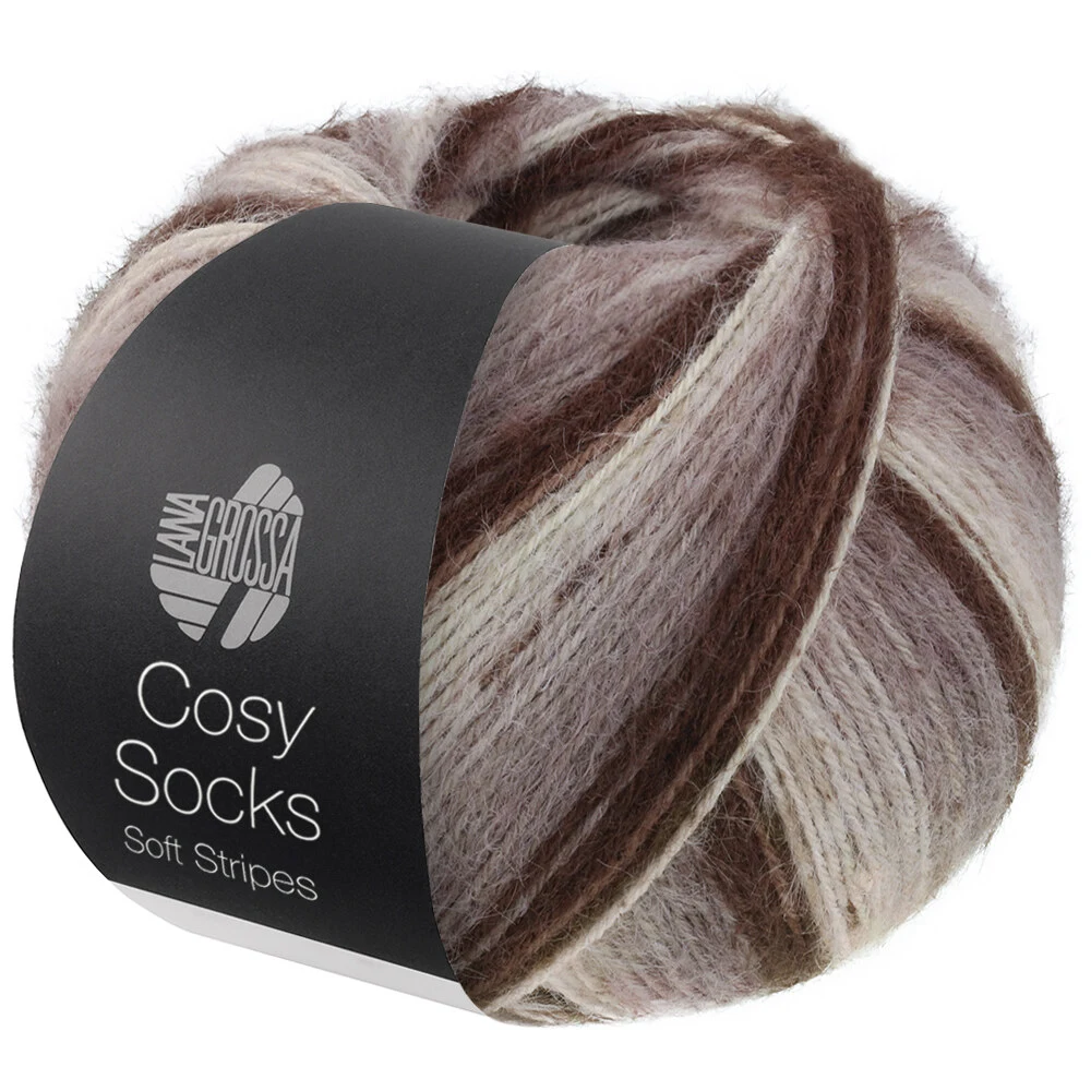 Lana Grossa Cosy Socks Soft Stripes ist ein weiches und strapazierfähiges Sockengarn aus einer klassischen Mischung aus Merinowolle und Polyamid. Das Garn zeigt weiche, fließende Streifen, die ein ruhiges und harmonisches Farbspiel im fertigen Strickstück erzeugen.