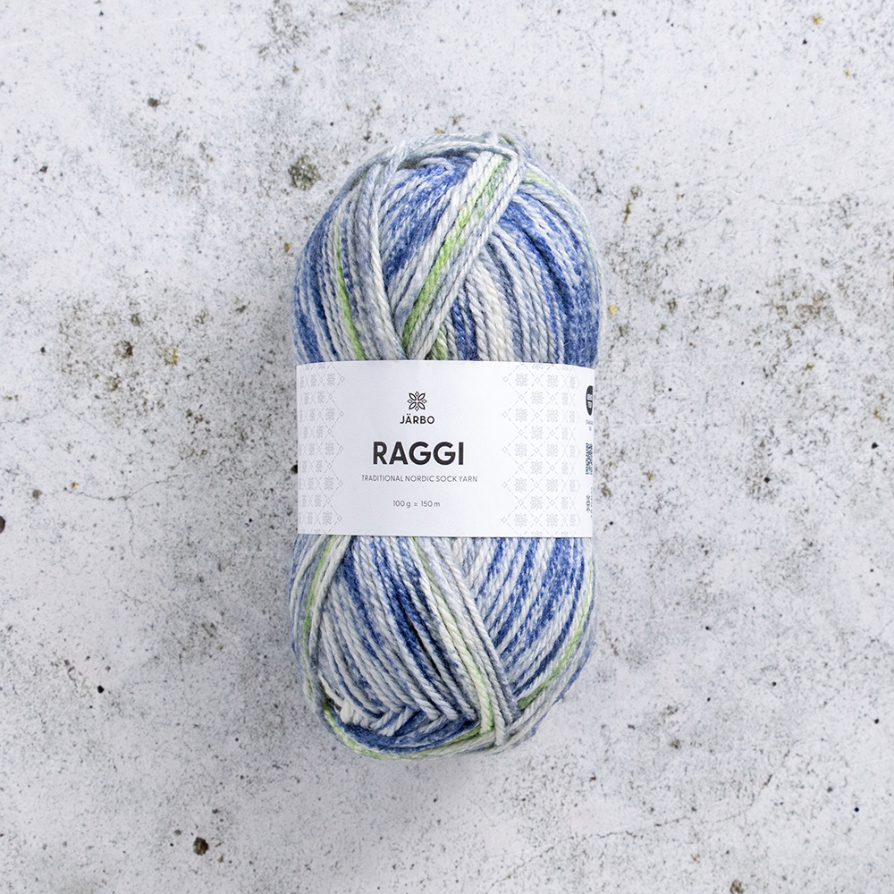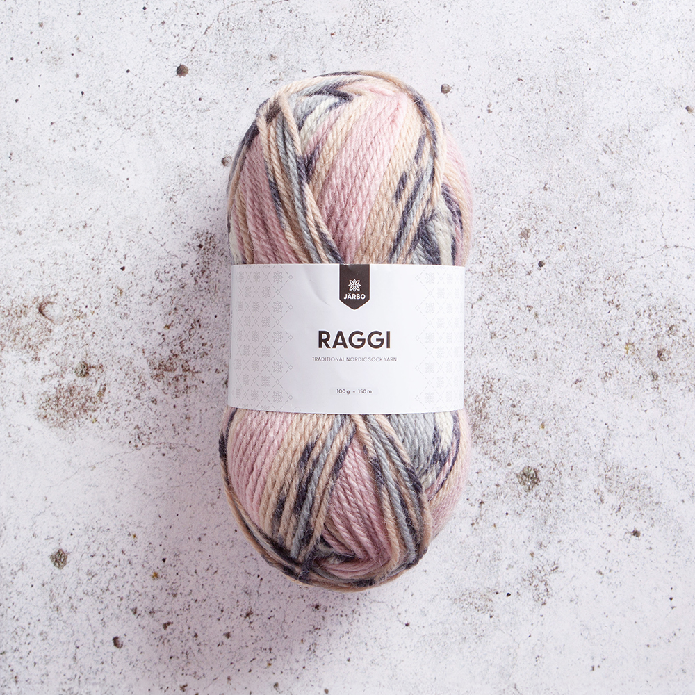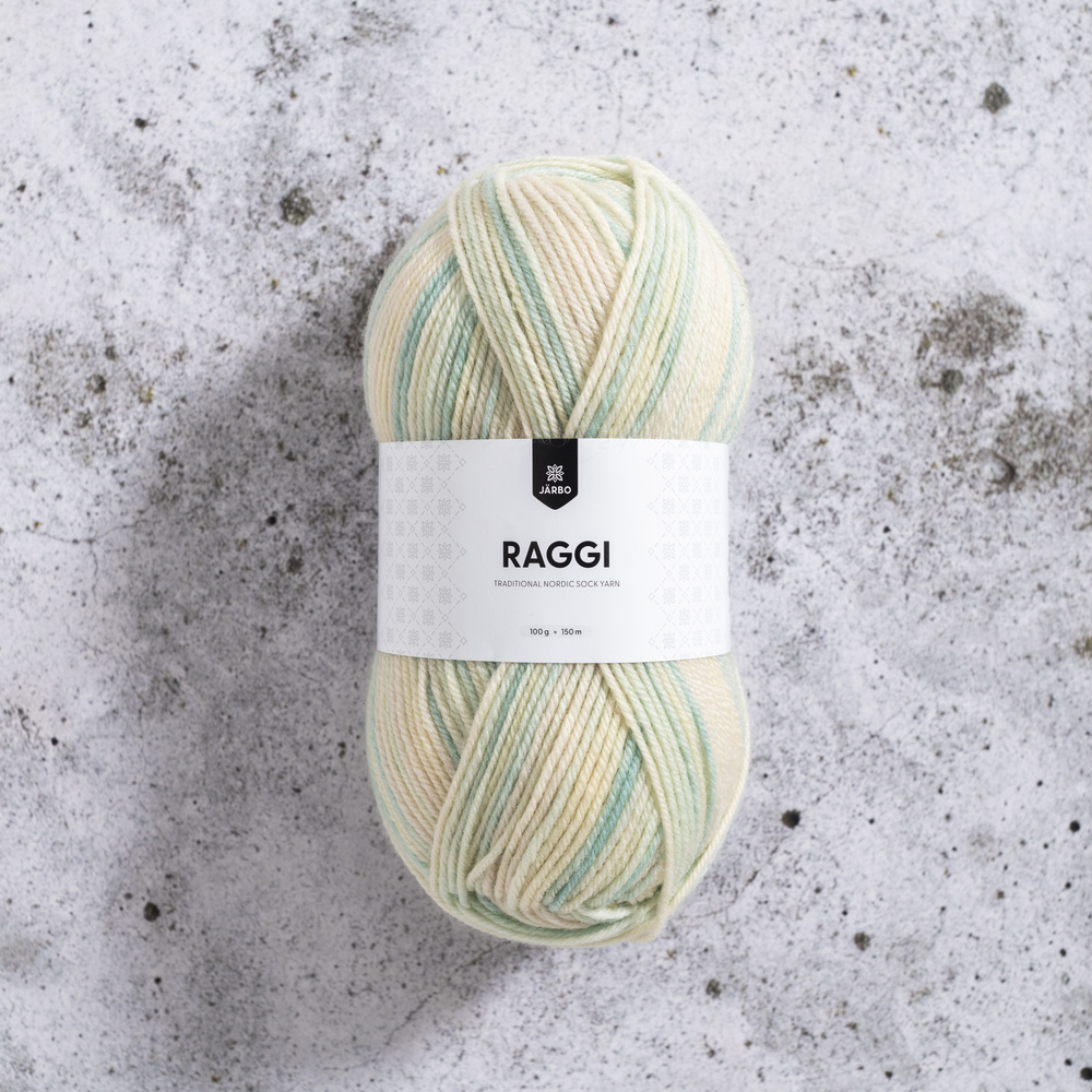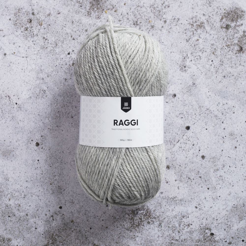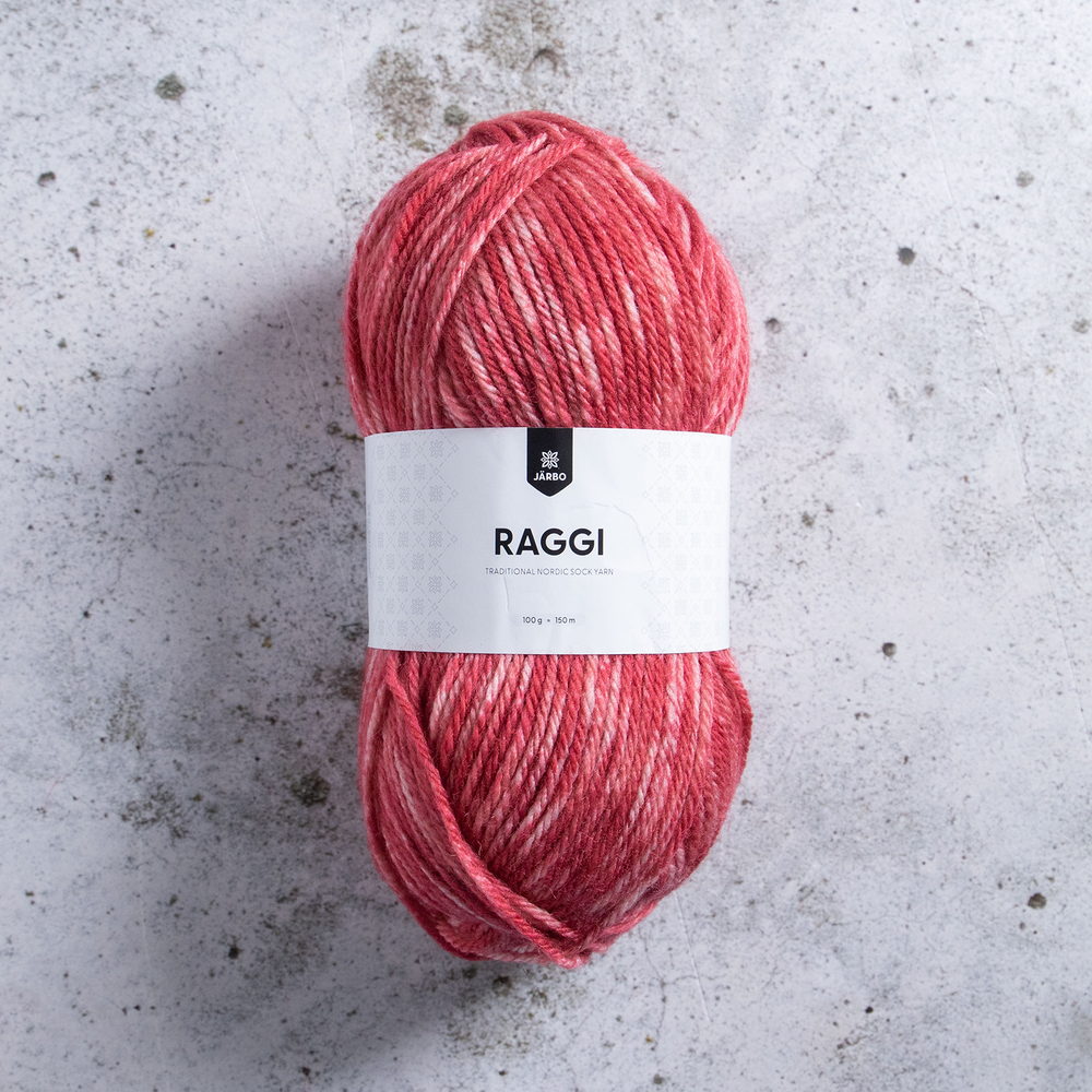 Raggi ist ein klassisches und strapazierfähiges Sockengarn von Järbo, hergestellt aus einer Mischung aus superwashbehandelter Wolle und Polyamid. Das Garn eignet sich sowohl für Socken als auch für warme Winterprojekte.