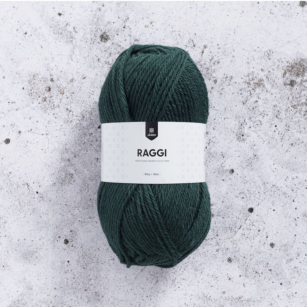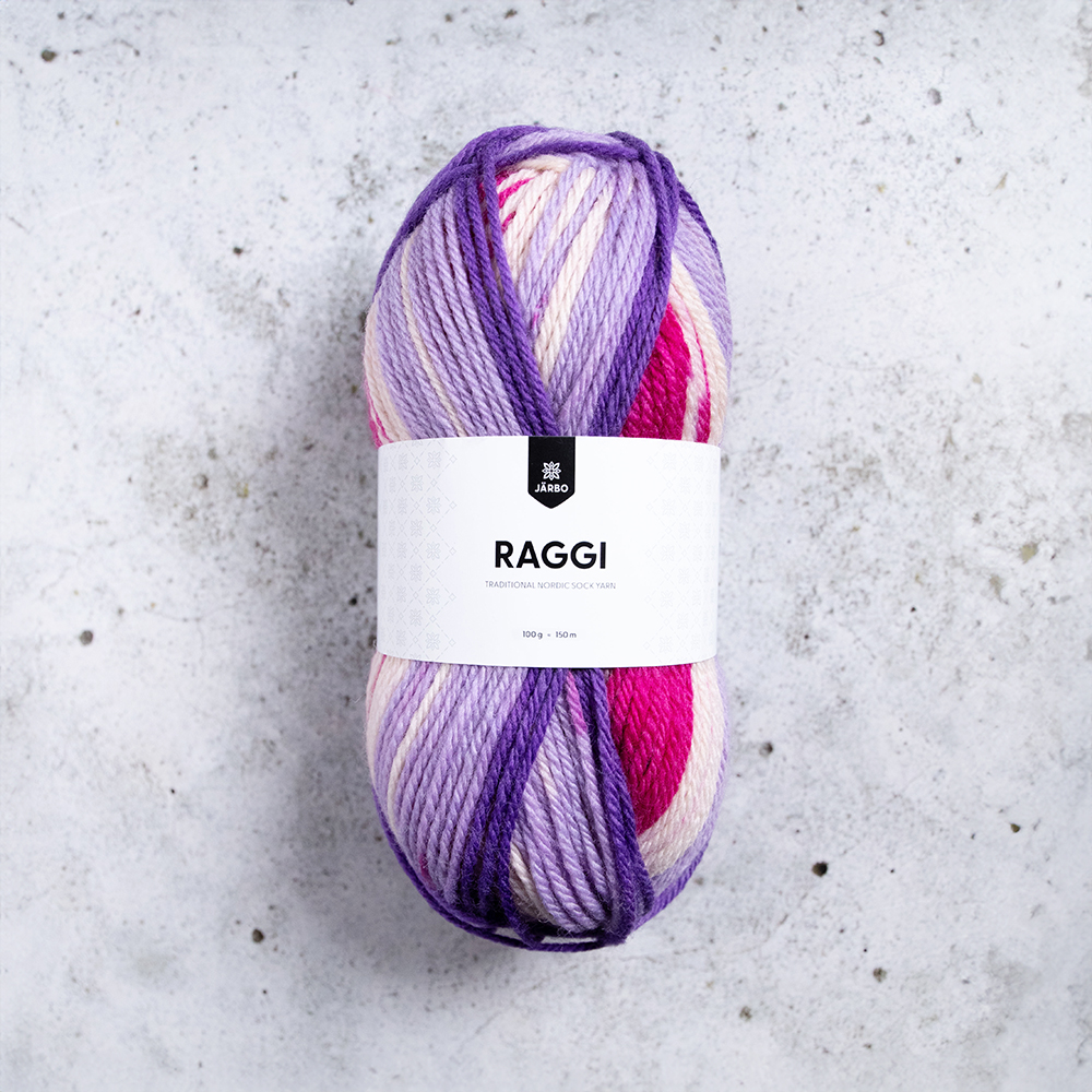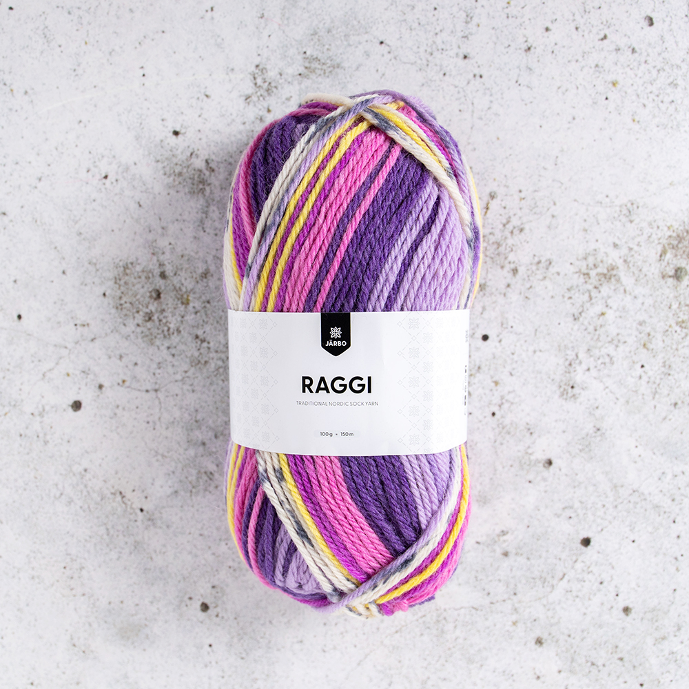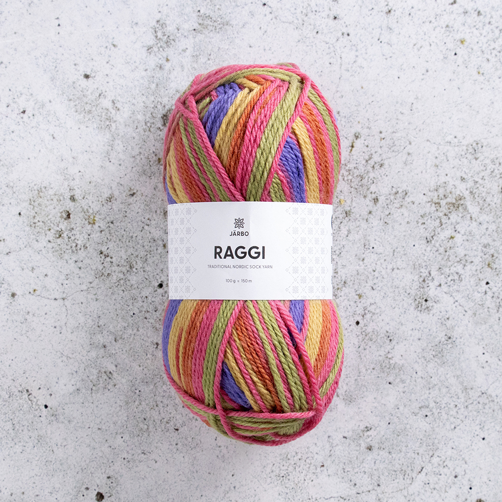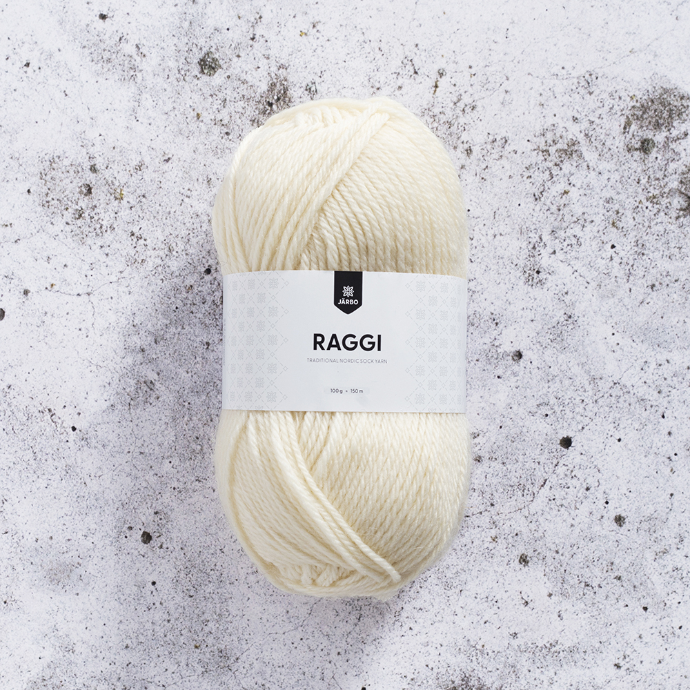 Raggi ist ein klassisches und strapazierfähiges Sockengarn von Järbo, hergestellt aus einer Mischung aus superwashbehandelter Wolle und Polyamid. Das Garn eignet sich sowohl für Socken als auch für warme Winterprojekte.