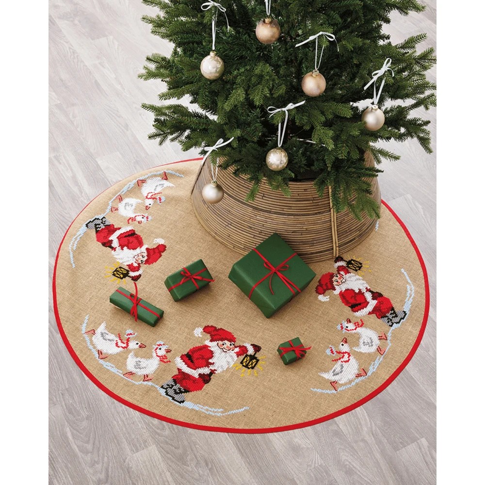 Stimmungsvolles Stickset mit klassischem Weihnachtsmotiv aus Weihnachtsmann und Gänsen. Das Set wird mit Kreuzstich und Steppstich auf robuster Jute gestickt.